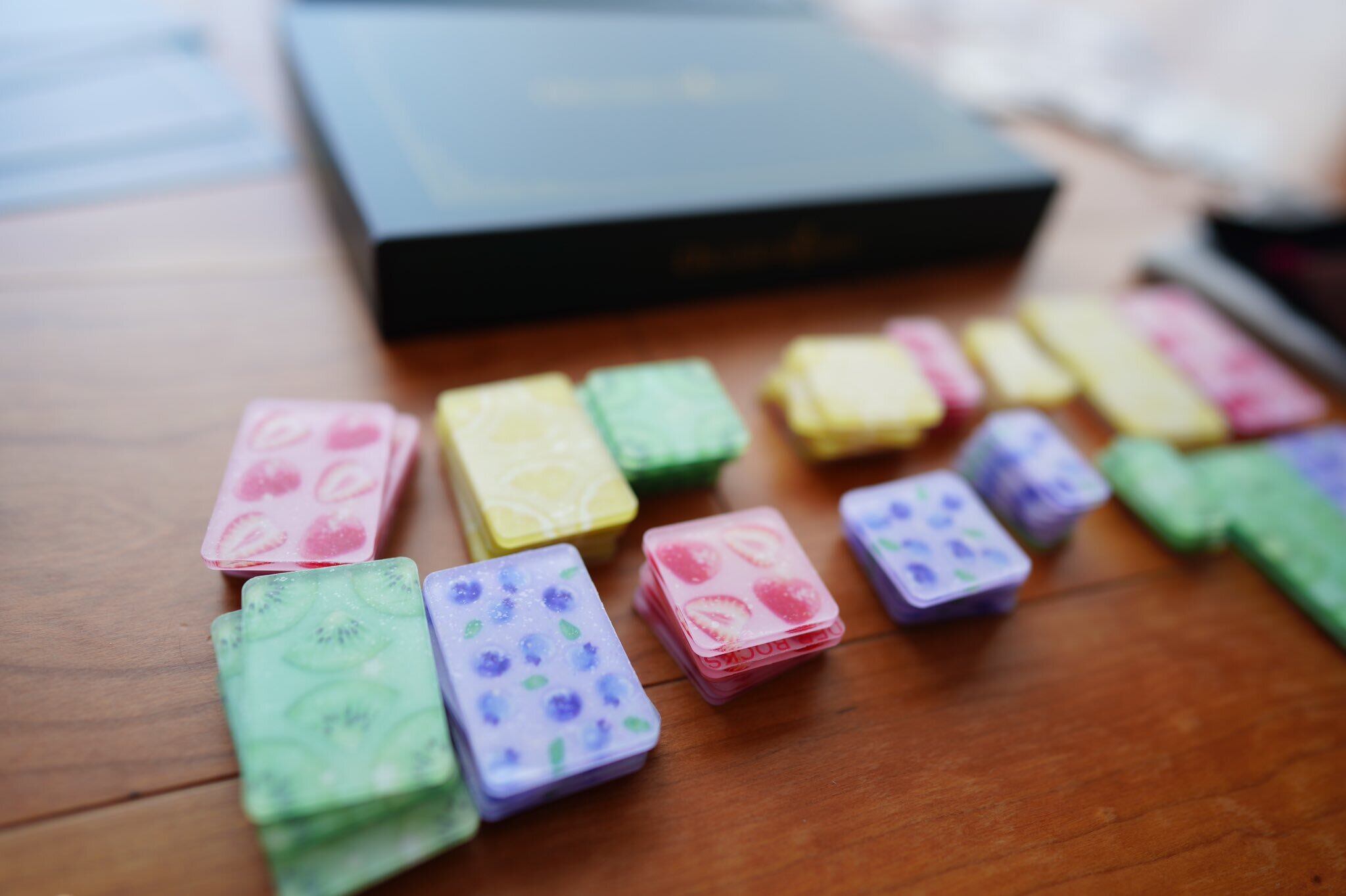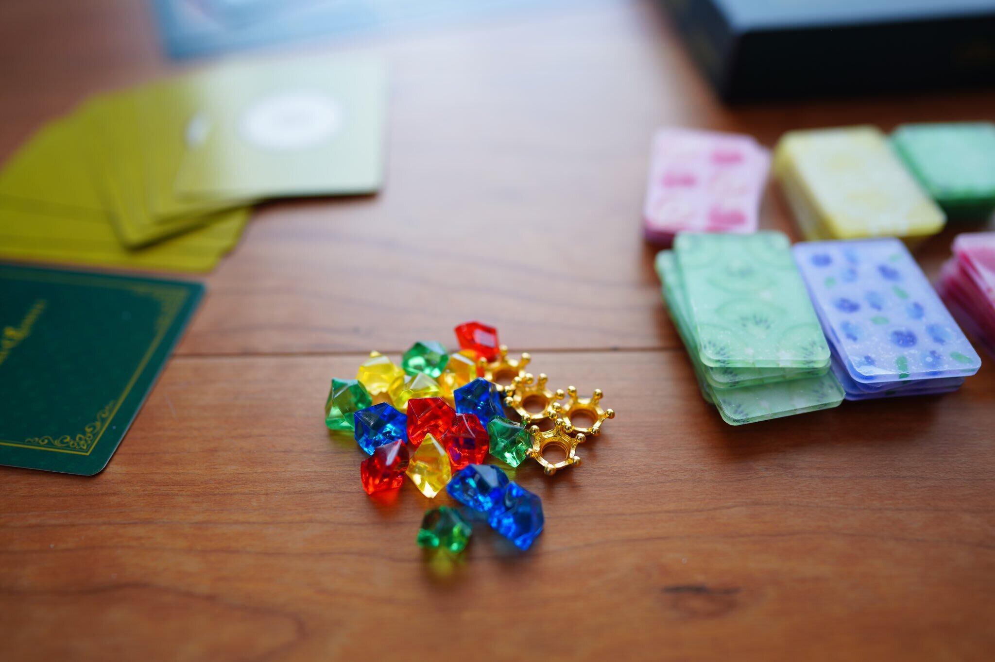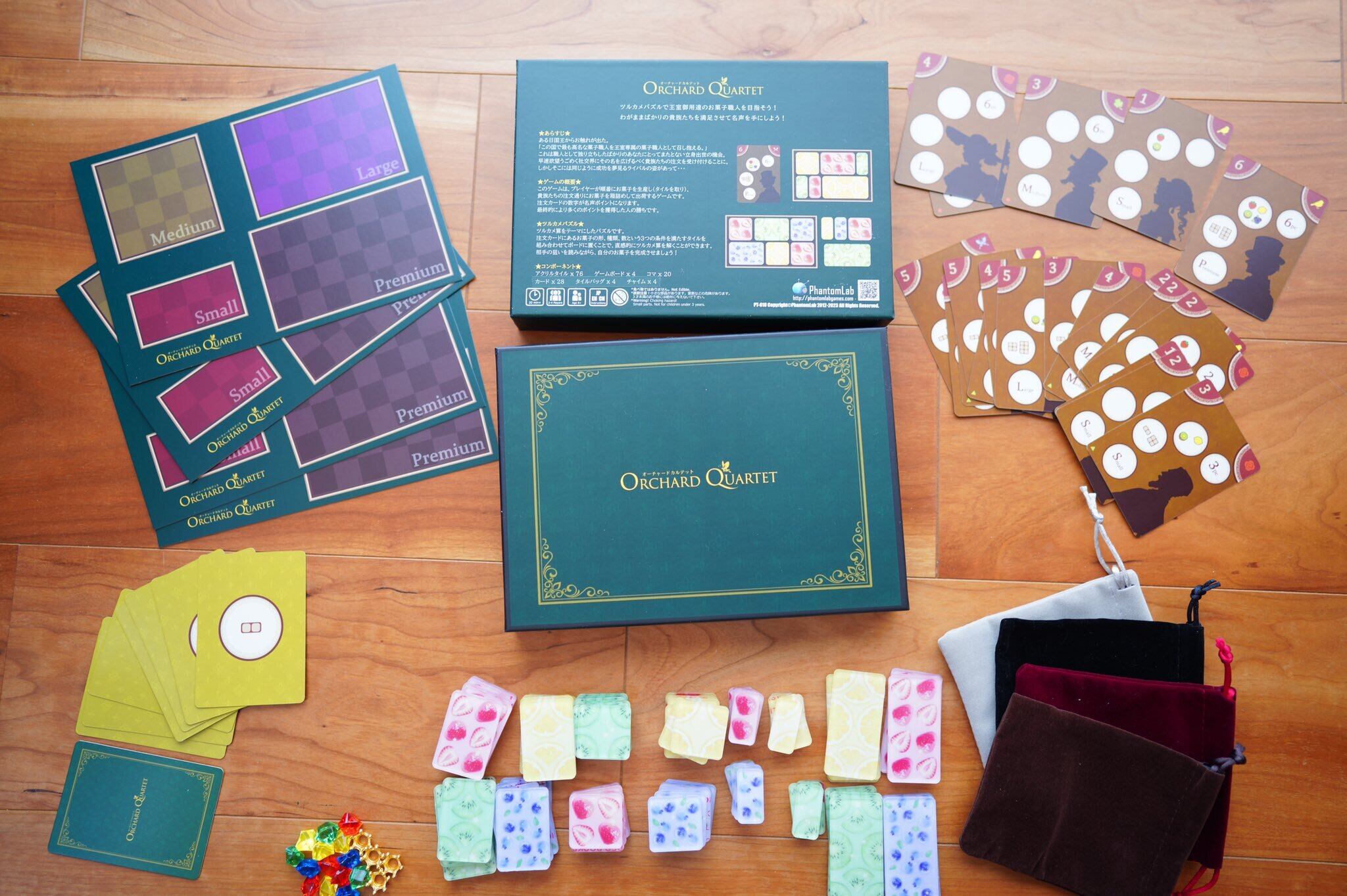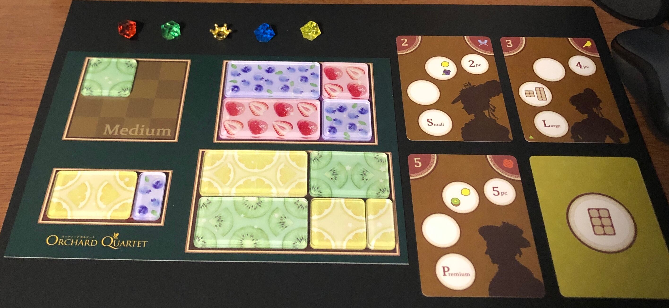 このゲームは、プレイヤーが順番にお菓子を生産し(タイルを取り)、貴族たちの注文通りにお菓子を箱詰めして出荷するゲームです。こなした注文カードの数字が名声ポイントになります。最終的により多くのポイントを獲得した人の勝ちです。