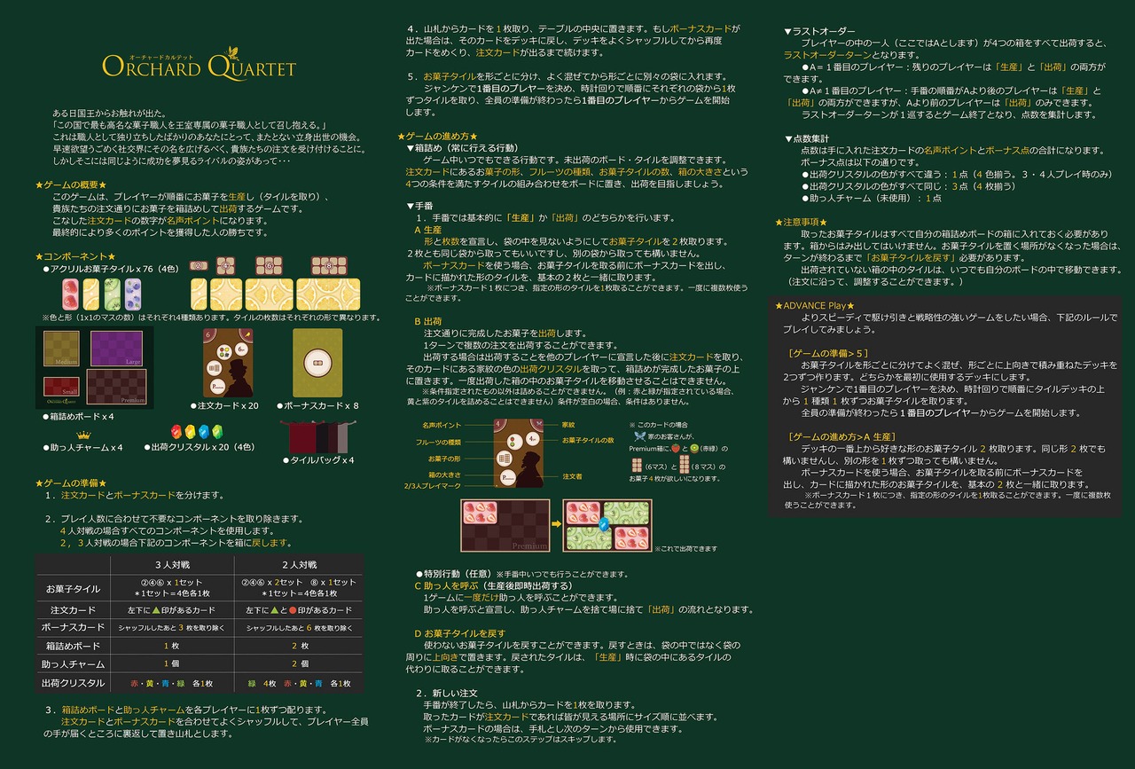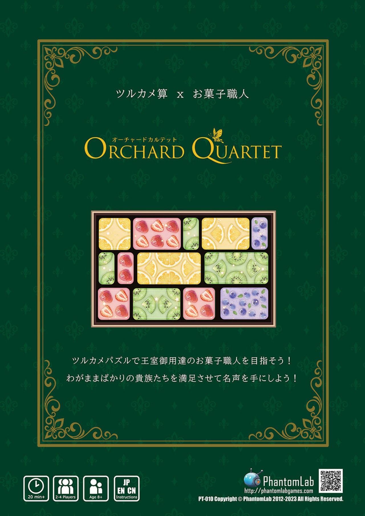 ツルカメ算をテーマにしたパズルです。注文カードにあるお菓子の形、種類、数という3つの条件を満たすタイルを 組み合わせてボードに置くことで、直感的にツルカメ算を解くことができます。相手の狙いを読みながら、自分のお菓子を完成させましょう!